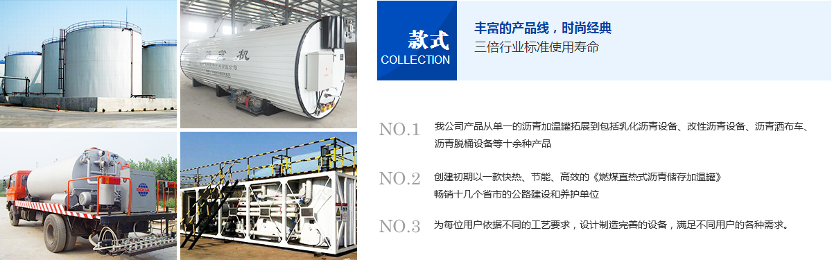 目前我公司產品從單一的瀝青加溫罐拓展到包括乳化瀝青設備、改性瀝青設備、瀝青灑布車、瀝青脫桶設備等十余種產品。